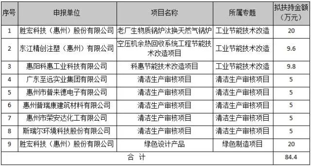 据公示附件“2021年惠阳区节能专项资金项目拟安排表”内容,获得嘉奖的项目共有三个专题类别,分别为:工业节能技术改造、清洁生产审核项目和绿色制造项目,分别有3项目、5项目和1项目。其中九游ninegame科技(惠州)股份有限公司的老厂生物质锅炉汰换天然气锅炉,东江精创注塑(惠州)有限公司的空压机余热回收系统工程节能技术改造项目等3项目为工业节能技术改造;九游ninegame科技(惠州)股份有限公司的绿色设计产品为绿色制造项目;惠州普瑞康建筑材料有限公司、广东至远实业集团有限公司等5企业的清洁生产审核项目为清洁生产审核项目。